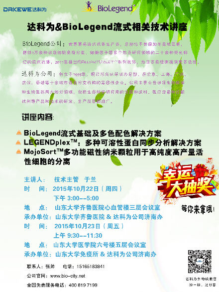 10月22日至23日,分別由山東大學(xué)齊魯醫(yī)院 、山東大學(xué)免疫所和達(dá)科為生物濟(jì)南辦共同承辦的流式專(zhuān)家講座,在山東大學(xué)齊魯醫(yī)院心血管三樓會(huì)議室和六號(hào)樓五層會(huì)議室如期舉行。