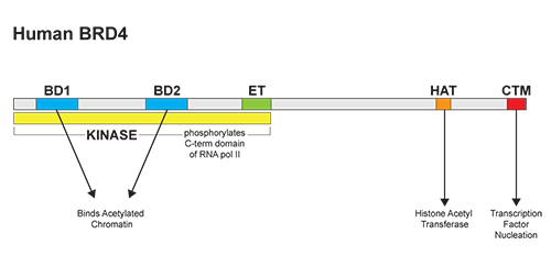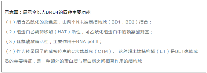 溴結(jié)構(gòu)域蛋白的BET家族的主要特征是它們都存在兩個溴結(jié)構(gòu)域和一種超末端(ET)結(jié)構(gòu)域2,6。其中,BRD4是研究較深入的。 BRD4具有四個主要的分子功能:(i)可以通過結(jié)合乙?;M蛋白維持染色質(zhì)結(jié)構(gòu),這種活性是由它的N-末端結(jié)構(gòu)域中的位點調(diào)控的; (ii)可以通過其HAT催化結(jié)構(gòu)域發(fā)揮組蛋白乙酰轉(zhuǎn)移酶(HAT)活性2,6; (iii)絲氨酸激酶活性,主要作用于RNA pol II;(iv)C端結(jié)構(gòu)域,可以發(fā)揮轉(zhuǎn)錄因子和復(fù)合物的結(jié)合和成核位點。研究發(fā)現(xiàn),BRD4常出現(xiàn)在幾種轉(zhuǎn)錄復(fù)合物,包括常見的輔因子調(diào)控子和P-TEFb 延伸因子6。 其C端結(jié)構(gòu)域也可以調(diào)控BRD4與許多眾所周知的轉(zhuǎn)錄調(diào)節(jié)因子之間的相互作用,顯著的有:P-TEFb,MYC,NFκb 以及p532,4,6-8等。