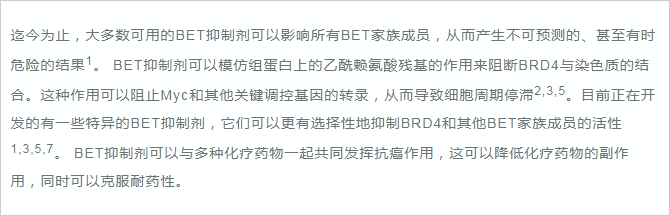 BRD4(溴結(jié)構(gòu)域蛋白4)是一種轉(zhuǎn)錄調(diào)節(jié)因子。研究發(fā)現(xiàn),BRD4在癌癥、自身免疫和炎癥性疾病中具有重要的作用1,2。 正常生理情況下,BRD4主要參與細(xì)胞周期過程中的基因表達(dá)調(diào)控,其可以與乙酰化染色質(zhì)結(jié)合,保持各種基因在細(xì)胞分裂循環(huán)過程中的穩(wěn)定表達(dá) ,這種現(xiàn)象被稱為表觀遺傳記憶或基因轉(zhuǎn)錄的“書簽”2,7。 同時,BRD4在調(diào)控分化和發(fā)育中也起著關(guān)鍵作用2,4。 如果BRD4缺失,骨髓干細(xì)胞將不能分化成為B和T細(xì)胞2。 BRD4亦是MEFs或B細(xì)胞重編程為誘導(dǎo)多能干細(xì)胞過程中重新表達(dá)干細(xì)胞基因所必需的,在成骨細(xì)胞分化過程中BRD4也發(fā)揮重要作用。 綜上,BRD4在細(xì)胞周期調(diào)控和分化中的重要作用使其成為癌癥和免疫系統(tǒng)疾病的新興治療靶點。