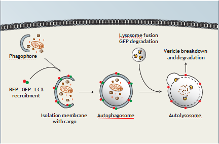 自噬通過溶酶體將胞漿物質(zhì)降解,是維持恒定程序的基本要素。研究自噬潮(autophagicflux)的關(guān)鍵蛋白是LC3(微管相關(guān)蛋白1輕鏈3)。在分離膜形成時(shí)胞漿中的LC3被招募并進(jìn)入自噬程序,此定位動(dòng)作被視為自噬膜的特征,用以檢測(cè)自噬的生成和發(fā)展。由LC3B融合一個(gè)綠色熒光蛋白(GFP)和一個(gè)紅色熒光蛋白(RFP)組成的嵌合蛋白 ,是檢測(cè)自噬過程的簡(jiǎn)單方法。自噬體的形成可被RFP-GFP-LC3標(biāo)記,顯示RFP和GFP雙信號(hào)。與溶酶體融合后,酸性環(huán)境可顯著降低GFP信號(hào),RFP信號(hào)卻保持穩(wěn)定。隨著自噬研究熱度的不斷提高,自噬報(bào)告基因細(xì)胞作為自噬過程研究的工具越來(lái)越多的受到廣大科研工作者的關(guān)注。